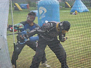 ![]() ↑ ジャッジが頭に手を当てていますが、 これは指差すプレーヤーがアウトになったことを示す 審判の公式なジェスチャーです。 |