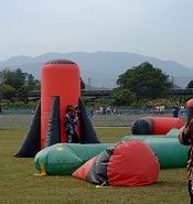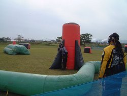 奥のエアバルーンから攻撃を行っている敵と戦っています。ロケットの羽をうまく利用して隠れつつも攻撃するチャンスをうかがっています。